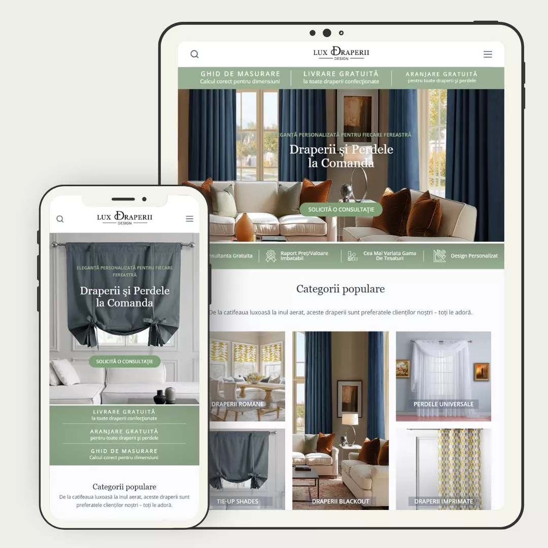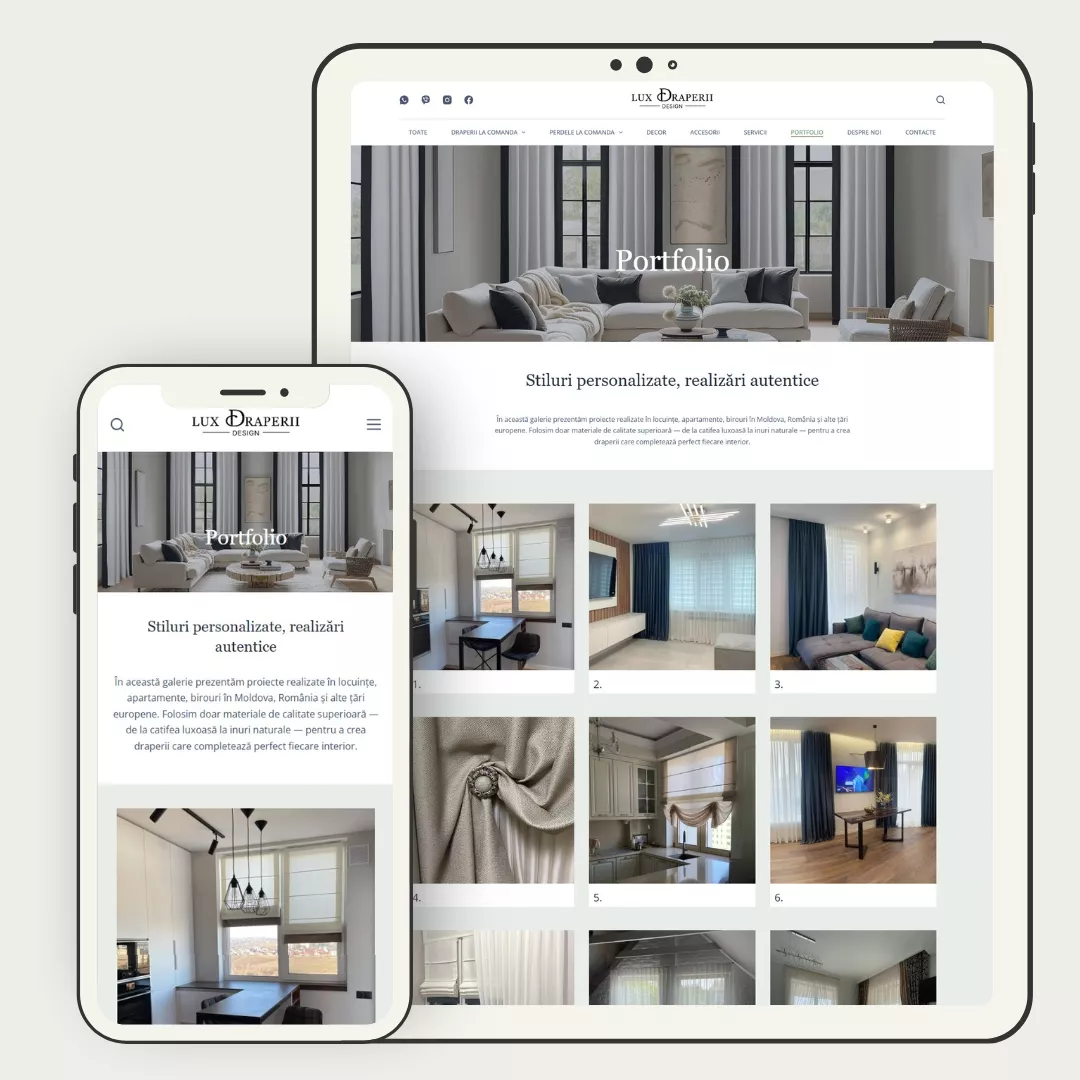 Am realizat un site de prezentare cu portofoliu de producție pentru Lux Draperii Design, o afacere activă în domeniul servicii complete pentru decorul ferestrelor cu draperii personalizate. Website-ul combină prezentarea profesională a afacerii cu un portofoliu clar de proiecte realizate.